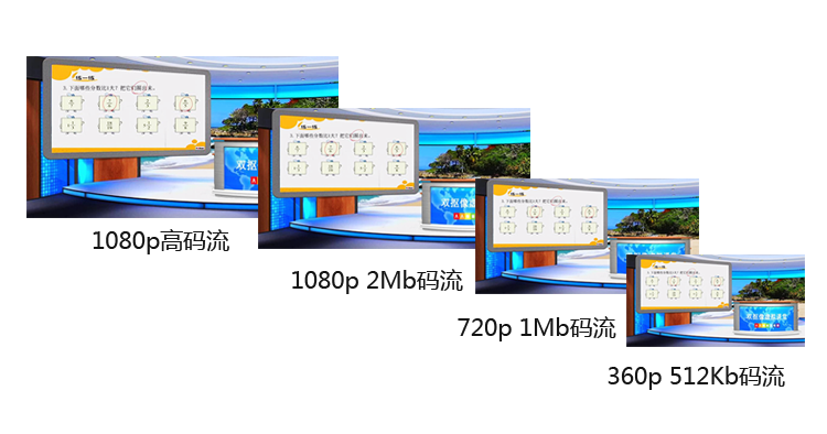 一次录制可以生成4码流视频,包括1080p高码流原始素材,1080p低码流网络直播视频,720p低码流网络直播视频和360p低码流网络直播视频。